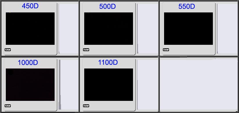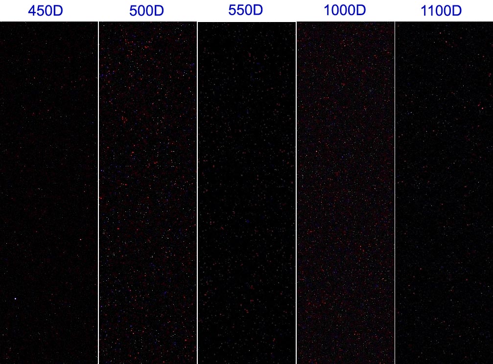 The true test of dark frame noise is how the camera performs over time while capturing long exposures and as the camera heats up. I do plan to test the 1100D (T3) camera in the same manner as was done for the other four Canon models over a period of two hours. (see update below).