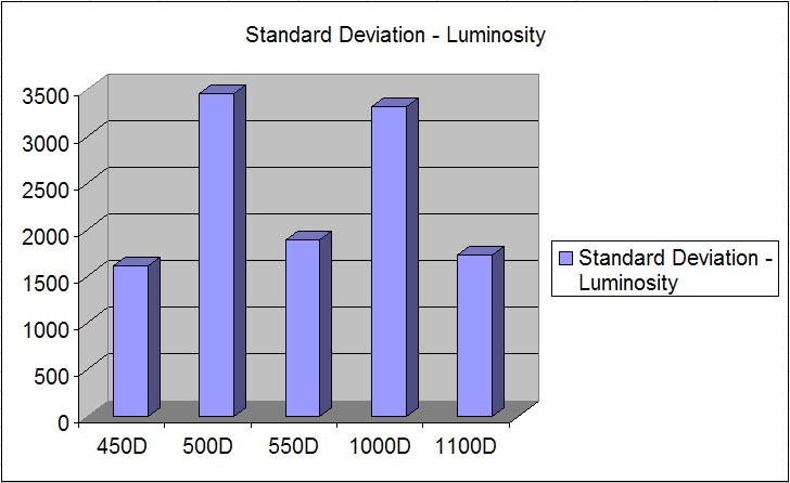 For the above cropped TIF dark frame images, image pixel standard deviation values for luminosity were recorded using Images Plus for all 5 Canon models and are displayed in the graph below:
