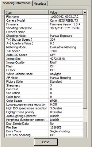My first testing with this camera model was to take a 5 minute dark frame at ISO 1600 as was done in previous testing I have done for the 450D, 500D, 550D and 1000D. Camera settings were adjusted to be similar to those used for testing those other models and the settings info from Canon's DPP for the 1100D dark frame test image is below: