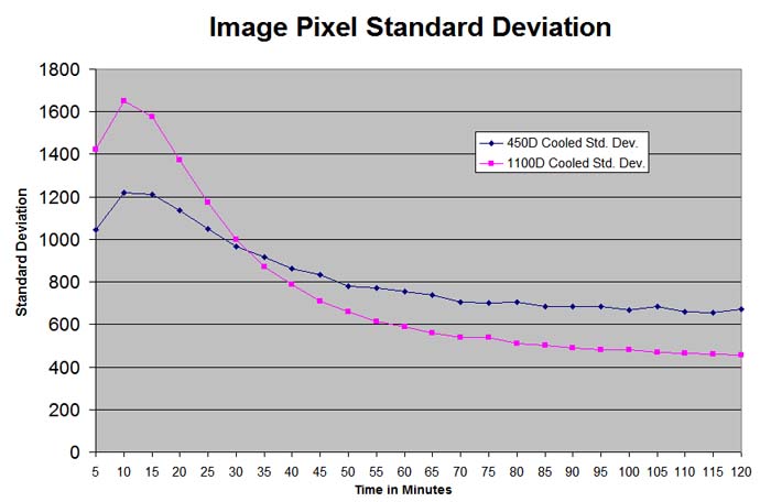 Using the Canon software "Digital Photo Professional", all Full Frame RAW files were converted to TIF files and the histogram luminosity value using "Images Plus" for image pixel standard deviation was plotted in the graph below. The standard deviation values for the 1000D trend higher for the first few minutes in line with the increasing internal temperature of the 1100D, but after 30 minutes of continuous exposures, there is a crossover in the plots. At 30 minutes the image pixel standard deviation for the 1100D goes lower than that of the 450D and stays lower for the remainder of the two hour period.