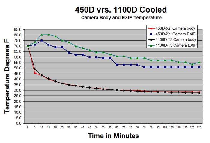 The above plot shows that the cooling chamber cooled the camera body at the same rate and degree for both camera models. A 43 degree Fahrenheit temperature drop was achieved for the 1100D (T3) and 42 degrees for the 450D. The plots for the EXIF recorded camera temperature show the 1100D heating up more during the first 15 minutes, most likely because of its additional in-camera video/audio circuitry. After the initial 15 minutes, both cameras cool at nearly the same rate with the 1100D staying about 5 degrees warmer than the 450D.