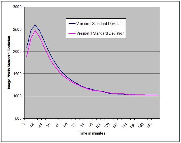 For the graph below, I converted the ISO 1600 Canon five-minute dark frame raws to TIFs using Canon's Digital Photo Professional and then recorded the standard deviation of the whole color image (4272 X 2848 pixels) for each dark frame. Note the comparison to the dark frames of the Version II cooler. It shows that the smaller size of the Version III cooler and one internal fan as opposed to two internal fans, provides the same reduction in dark frame noise.