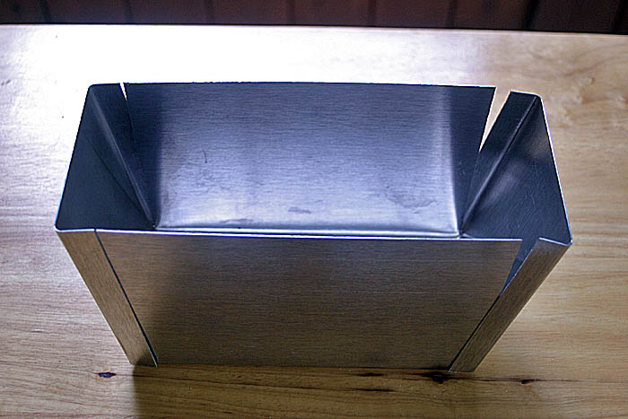 A very thin .025 sheet of aluminum (1/40 inch) is formed into a rectangular shape just large enough to fit the Canon 450D body: