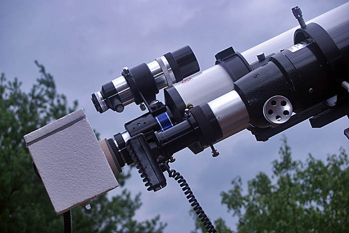 In the image below the peltier cooled Canon XSi (on right) is in the focuser of an Astro-Tech 127mm triplet refractor. In the background is a Meade DSI Pro imager in the focuser of an Orion ED80 used for autoguiding: