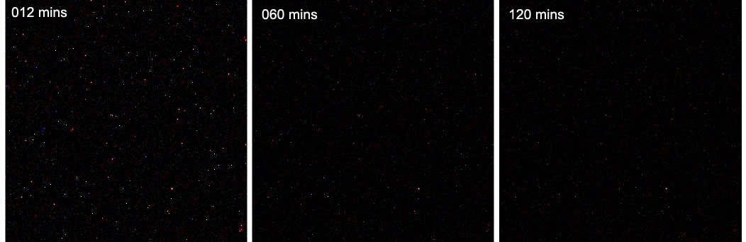 Below is a comparison of the 342 X 342 pixel center crops of the five-minute dark frames at ISO 1600 taken at ambient temperature (77.4 degrees Fahrenheit) and after one hour of cooling ( 37.6 degrees) and two hours of cooling ( 34.0 degrees) cooler temperature: