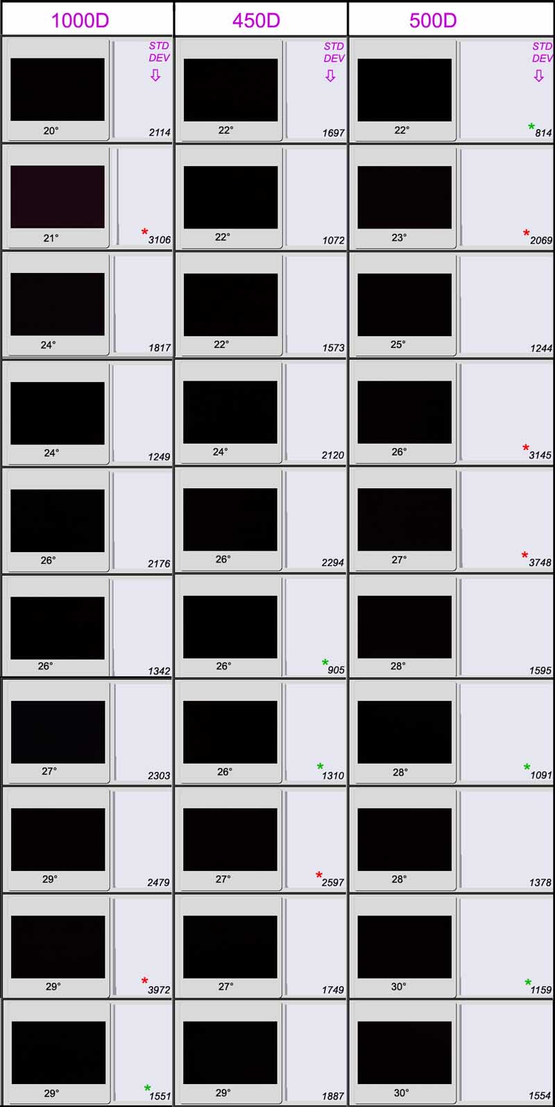The standard deviation values above are listed only to compare cameras of the same camera model. As camera temperature increases, one would expect dark frame noise to increase. In the above graphic I've marked the cameras that appear to be somewhat noisier with a red asterisk * and those that appear to have less dark frame noise with a green asterisk *.