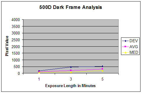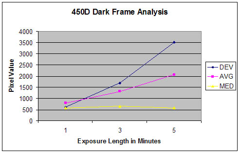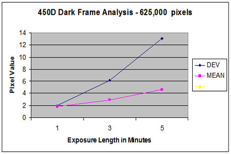 A request was made on the DSLRmodifications forum to provide some quantitative information on the dark frame test results of each camera. Using the "photometric information" function of the software Images Plus for the luminance of each entire dark frame RAW image, the data was recorded and an excel spreadsheet was used for the following graphs.