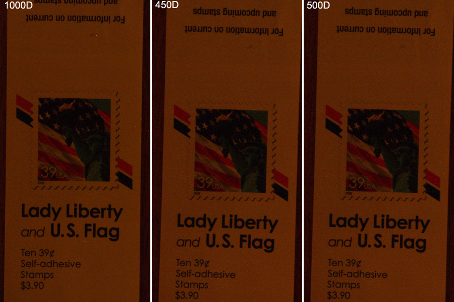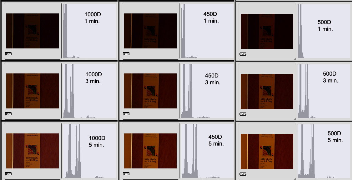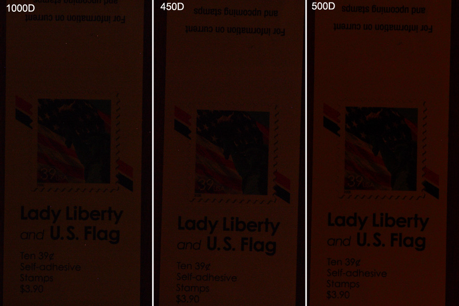 For the sensitivity tests below, the cameras were all powered with the same battery and the same 4GB SD card was used to store the RAW images. Bulb exposures were taken using a Canon RS-80N3 remote switch for all three cameras. The viewfinders were covered to block any ambient light in a darkened room. A Sigma Zoom lens was used at 200mm and F32 with the cameras set at ISO 1600. For the Canon 500D, in the Custom Functions menu item, "long exposure noise reduction" was turned off and "high ISO speed noise reduction" was disabled. Exposures were taken at one minute, three minute and five minute lengths. Liveview focusing was used at 10X zoom for all three cameras.Imaging was done in a dark room with a 5 watt incandescent lamp in one corner of the room. The lamp was covered with a diffuse material to limit the amount of illumination for the testing. This was done to crudely simulate astro imaging of a faint deep sky object. Dark frames were not subtracted.