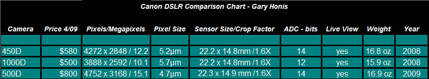 As 2009 comes to and end, the Canon 500D (T1i) has been on the market for eight months, and examples of astro images with the DSLR are just now becoming a little easier to find online. The Canon 450D and 1000D have been very popular cameras for astro-imaging and maybe because they have been performing so well, those considering new cameras have been opting for the proven cameras instead? I had the opportunity to test three cameras sent to me for modification. For theses tests, I tried to have good control conditions. The cameras were all purchased from the same supplier and were tested before modification. Testing of all three cameras was done at the same time with imaging done indoors and at room temperature. Here are some key specifications for all three camera models: