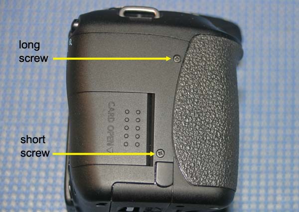 5. Remove screws located near neck strap mounts. One screw is short; the other is long as shown: