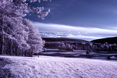 3. Infrared Photography: A Full Spectrum modified camera can be used for infrared photography by adding an external infrared pass filter such as the popular Hoya R72. The part of the spectrum seen by the imaging chip is referred to as near-infrared as opposed to far-infrared. An infrared filter allows infrared (IR) light to pass through to the imaging chip while blocking all or most of the visible light spectrum. The resulting infrared images have a "dreamlike" appearance in which blue sky is very dark, atmospheric haze disappears, vegetation such as trees and grass glow brightly and eyes appear black. Post-processing techniques such as false color processing are quite often used for displaying the infrared images. Non-modified cameras or those modified instead with the Baader UV/IR filter are not capable of producing infrared images of the same quality because infrared light is blocked inside the camera.