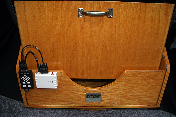 Another possible arrangement is to mount the receiver and hand controller using the provided velcro to the outside of the rockerbox as in the photo below: (20" telescope in photo)